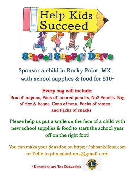 Please support our school supplies program below. You can zelle your donation to phxasianlions@gmail.com or go to our donation page. Thank you!
